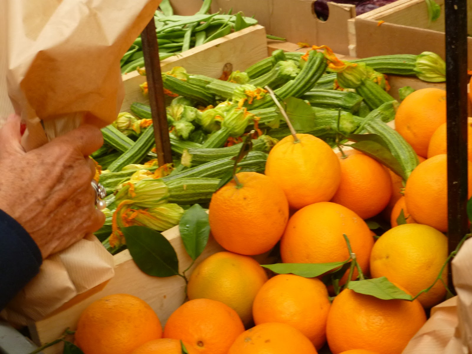Au mercato de Testaccio, nous achetons oranges, tomates, fèves et pain aux olives. C'est un grand marché couvert dans lequel nous déambulerons un long moment à admirer les étals de fleurs de courgettes et à écouter la joute verbale entre commerçants et clients.